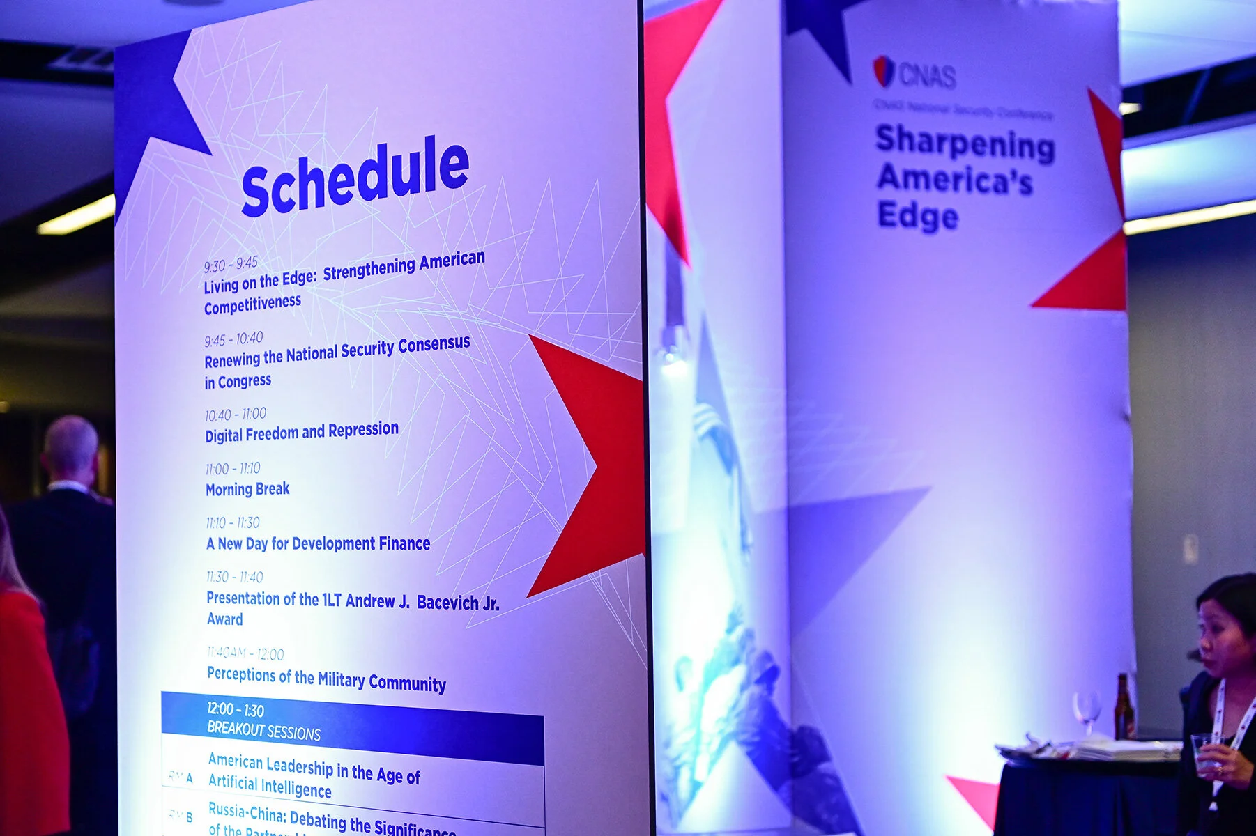 Sharpening America’s Edge, the title of a conference held in Washington, D.C., explored ideas that America can use to sharpen its strategic edge in an era of heightened global competition. With the focus being on America, I explored concepts that used iconic American imagery—and found that the pointed edge in the American star, cropped and abstracted, fit the theme perfectly. I used the primary brand colors with the addition of a light pink to keep the look fresh and current. The star crops are dynamic and used to showcase different sessions and topics. Printed content included column wraps, standing banners, window vinyls, agenda booklet, nametags, and a stage backdrop.